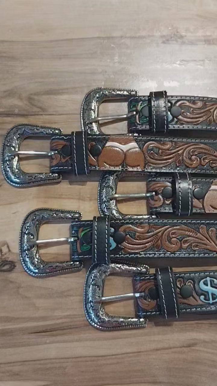 tooled leather belt with bikini bottom detail and dollar signs.