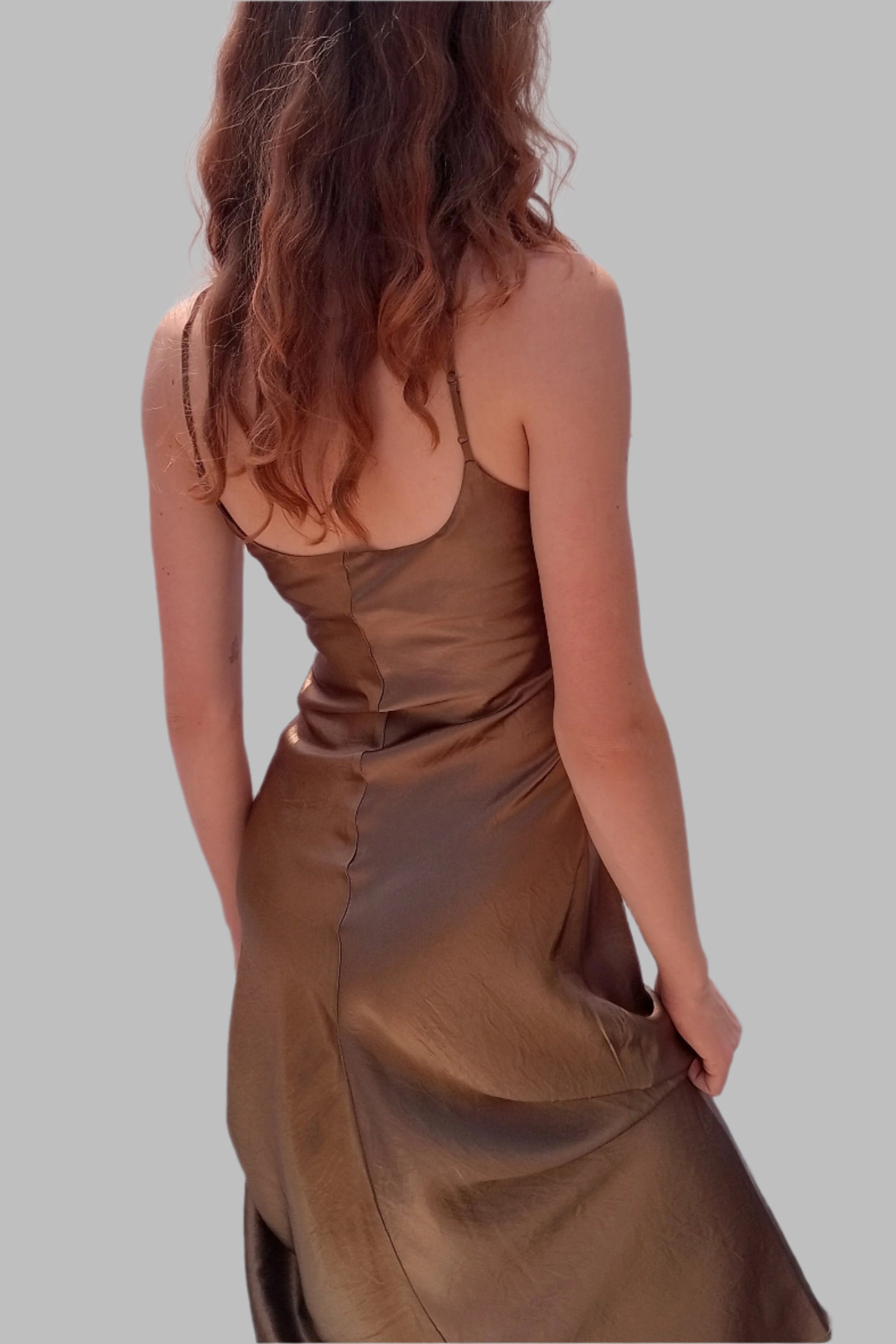 Cut on the bias and featuring adjustable shoe string straps with a side zip.